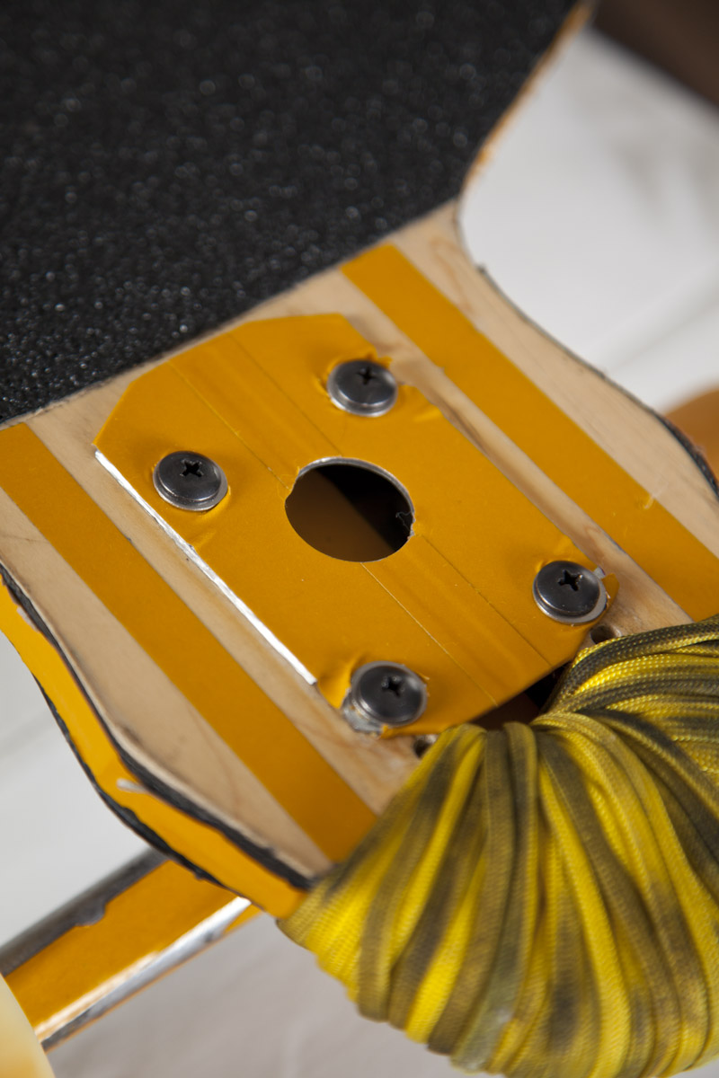 | Gorilla glue tape runs the entire perimeter of the board including just below the gas pedals, covered by a layer of reflective white tape |