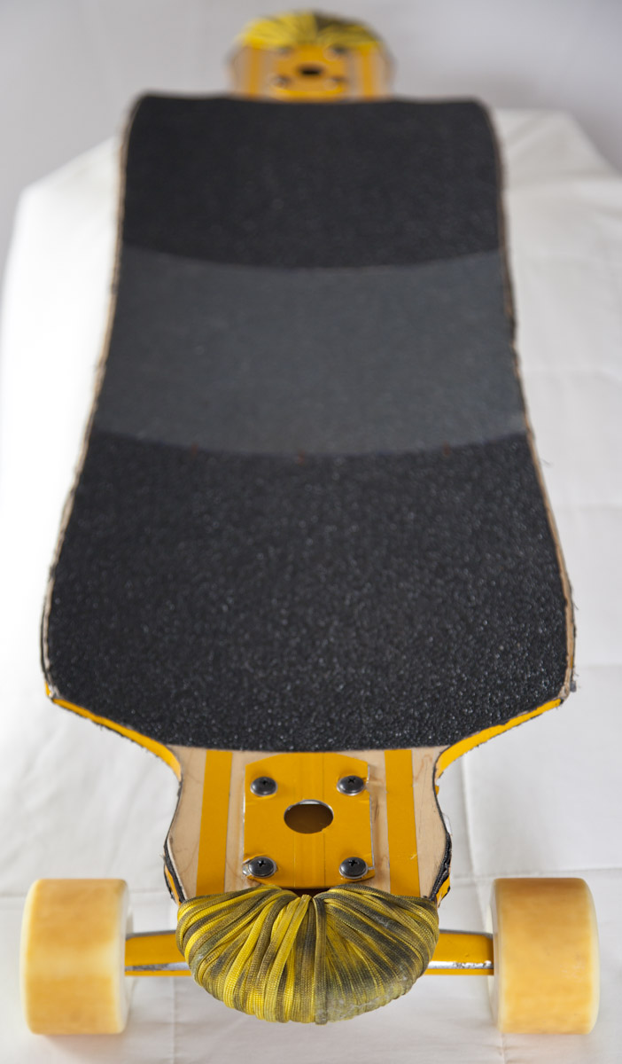 I decided to create some custom nose and tail protectors, designed to cut down on the impact damage all boards suffer from hitting curbs and such when they get away from the rider or when you eat it. I used PVC pipe bends, cut with a Dremal to fit precisely. I used quarter inch thick Vibram shoe sole rubber between the PVC and the board to act as a shock absorbers. These are held on by pressure alone and can be easily removed and replaced.